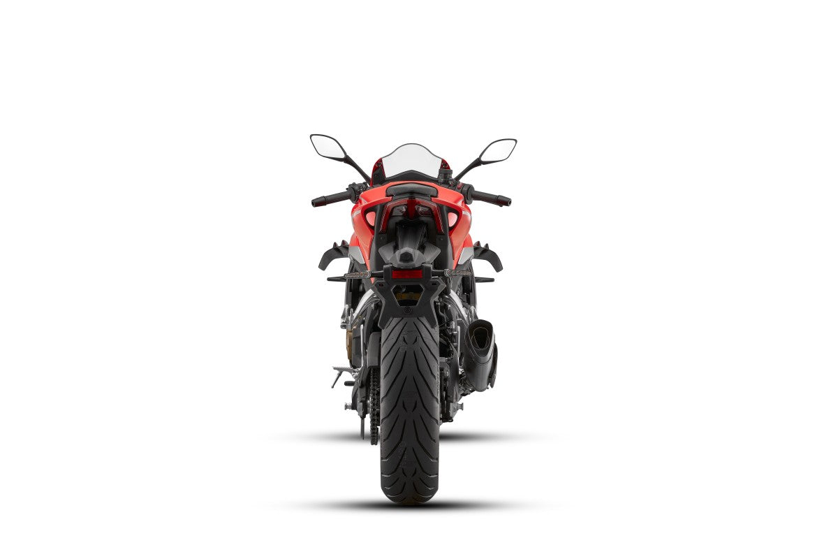 The SRK 450 RR boasts a refined riding experience, featuring Marzocchi USD forks upfront and a Marzocchi telescopic coil spring oil-damped rear suspension, promising a smooth journey whether you're riding tight curves on a mountain pass or taking on the tight curves on a race track. Safety and control are paramount, with dual 300mm Brembo discs with ABS in the front and a 240mm Brembo disc with ABS in the rear, ensuring you're ready to stop safely at a moment's notice.